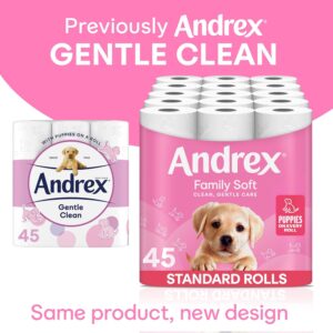 - A Pure and Gentle Clean: 45 toilet rolls of Andrex Family Soft Toilet Paper for a confident, gentle clean for you and your family