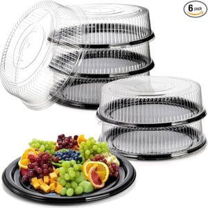 You will get 6 black plastic serving trays with clear dome lids. Each tray height measures approx. 4 inches, diameter measures approx. 16 inches.