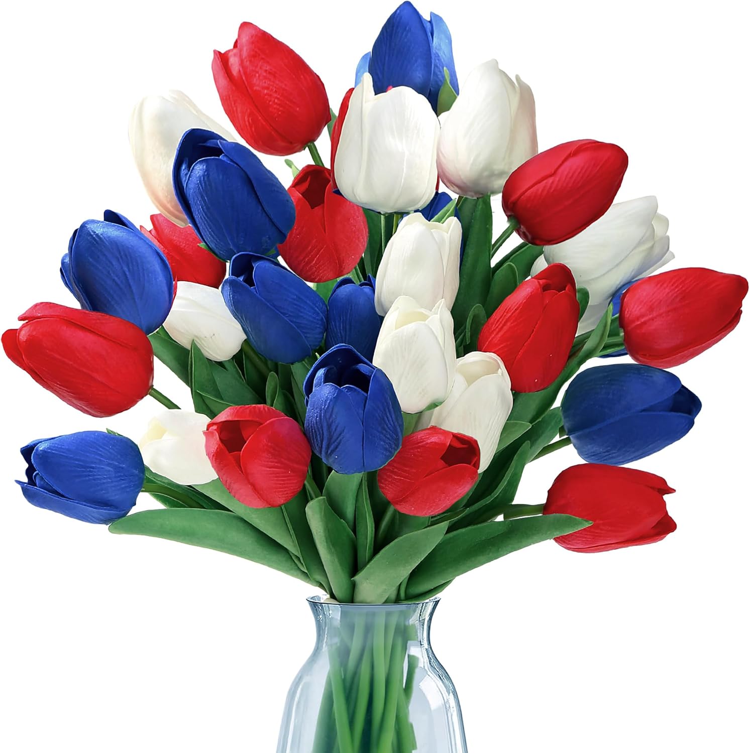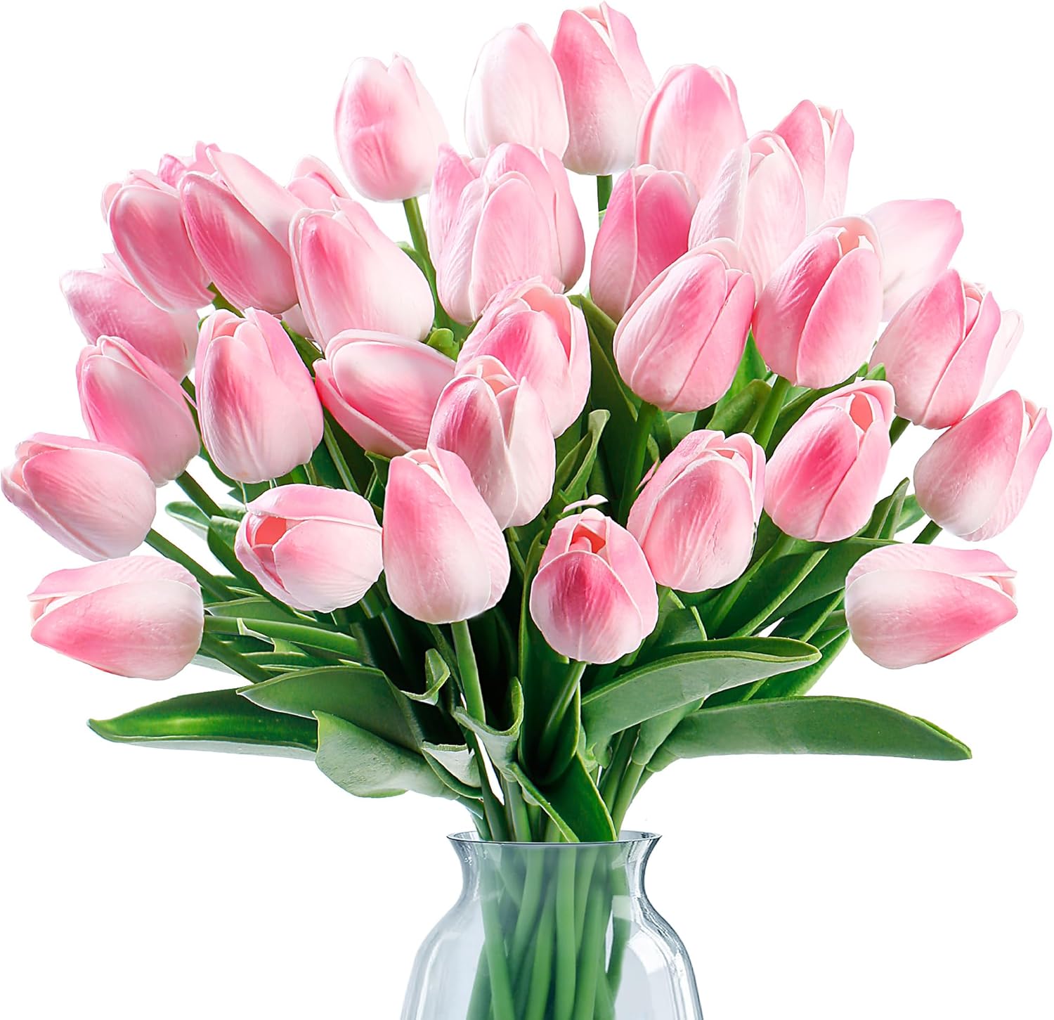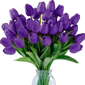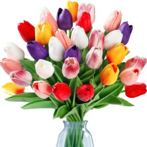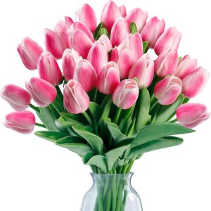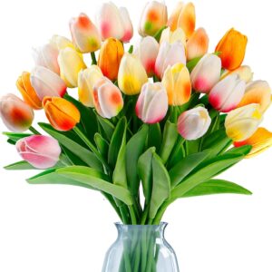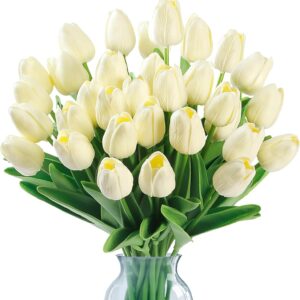 - [PREMIUM MATERIAL]:The fake tulips are made of environmentally friendly PU,soft and has real touch tulips feelings. Inside the stem is durable iron wire. It enables you to easily bent and cut to fit different vases. Compared to original tulips craftsmanship,our tulips used advanced premium material, no afraid of sunlight,wither,wrinkle,odor or fade, remain the beauty of fresh flowers and easy to maintain.